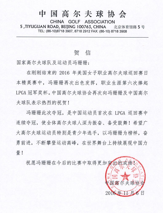 中国高尔夫协会再次为国家高尔夫球队及运动员冯珊珊发来贺信,具体内容如下: