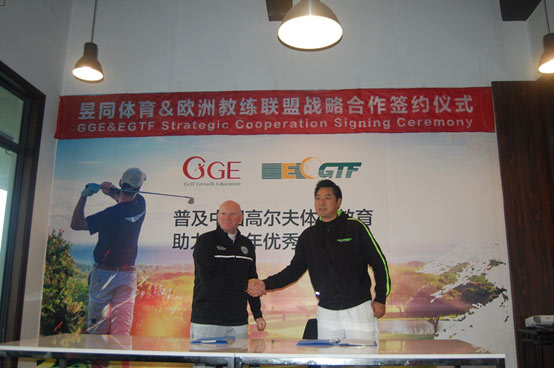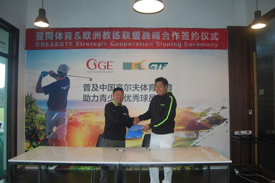 近日,上海昱同体育(GGE)与欧洲高尔夫职业教练联盟(EGTF)签署战略合作。上海昱同体育负责人朱彤彤先生与EGTF全球副总裁,Bill Abbott总教练出席并见证签约仪式,双方正式结成战略合作伙伴关系。