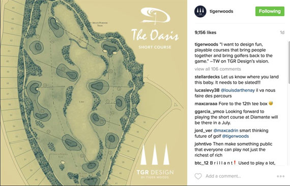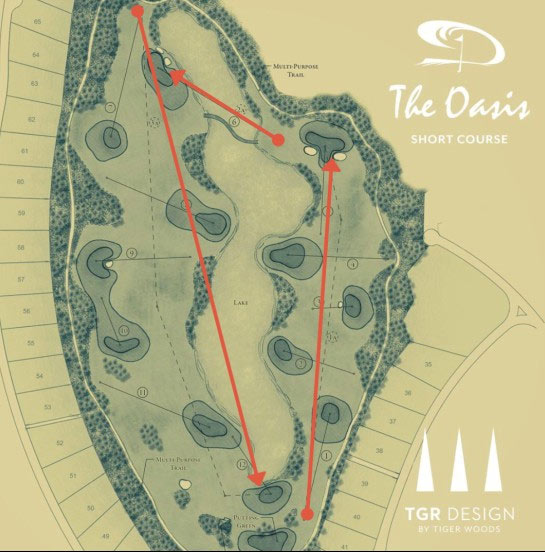 这周,伍兹将自己为卡波圣卢卡斯钻石度假村(Diamante Cabo San Lucas Resort)设计的短洞场绿洲球场(The Oasis)的设计图大纲po上了社交账号: