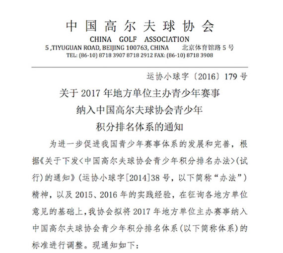有意向将所主办赛事纳入中高协青少年积分排名系统的单位,请于2017年2月5日前将赛程表、竞赛规程及相关信息报至中国高尔夫球协会。中高协将在审核后正式公布相关信息。