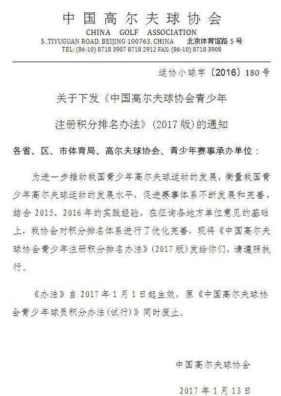 近日,中国高尔夫球协会下发《中国高尔夫球协会青少年注册积分排名办法》(2017版),新的版本对青少年积分排名体系进行了优化完善,是一次重要的升级。主要优化有:赛事积分档次向国际化发展,开始计算阵容分;单项技能挑战赛计入积分体系;D、E组可以获得积分;向港澳台和外籍青少年开放注册和积分。