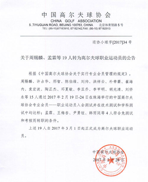 公告:周赐麟、孟霖等19人转为高尔夫球职业运动员