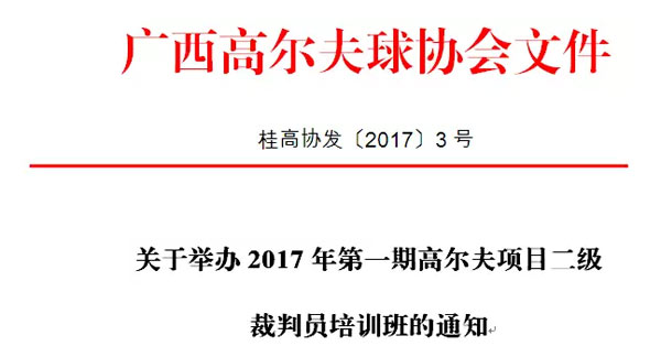 根据《国家体育总局小球中心关于高尔夫球项目贯彻实施<体育竞赛裁判员管理办法>有关问题的通知》(小球字【2016】 662号)及《自治区体育局关于授权广西高尔夫球协会开展裁判员技术等级认证的通知》(桂体竞【2017】3号)精神,经按程序向中国高尔夫球协会备案,广西高尔夫球协会将在广西开展高尔夫项目国家级以下裁判员培训工作,现将2017年第一期二级裁判员培训班有关事项通知如下。