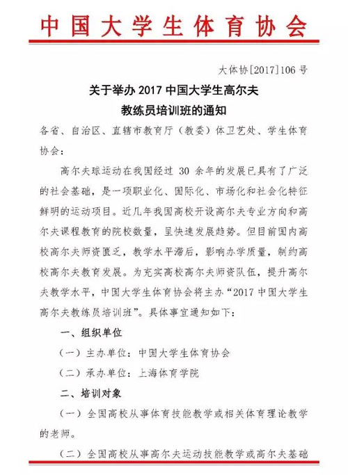 2017中国大学生高尔夫教练员培训班的通知