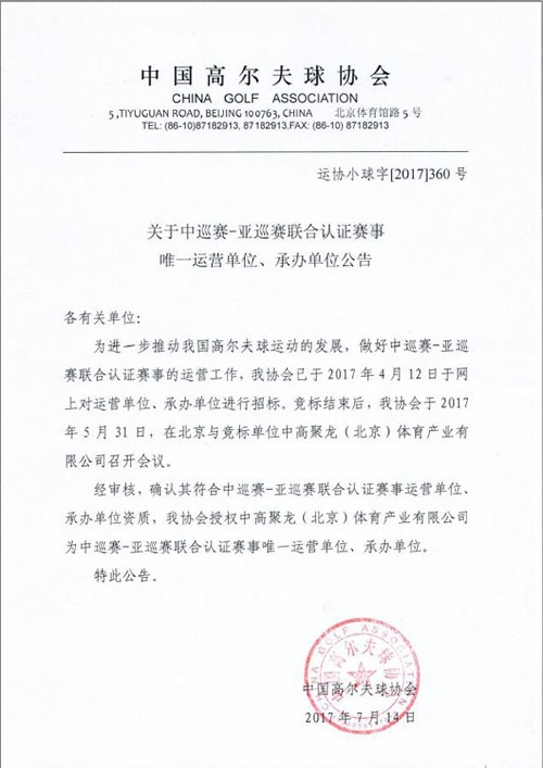 北京时间7月14日,中高协发布公告:授权中高聚龙(北京)体育产业有限公司为中巡赛-亚巡赛联合认证赛事唯一运营单位、承办单位。公告如下: