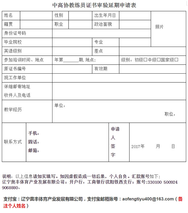 请符合条件的教练员仔细填写证书审验申请表