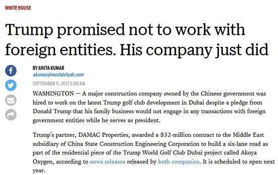 尽管特朗普当选美国总统的时候就已经承诺过,在他就任美国总统期间,特朗普的家族公司不会参与或者追逐与外国政府机构或者实体组织相关的生意。但是作为特朗普集团位于迪拜的特朗普世界高尔夫俱乐部(Trump World Golf Club Dubai)的合作方之一,达马克房地产公司(DAMAC Properties)将建造迪拜的特朗普世界高尔夫俱乐部的建造工程项目给了中国建筑位于中东的子公司,签下了3200万美元的合同。