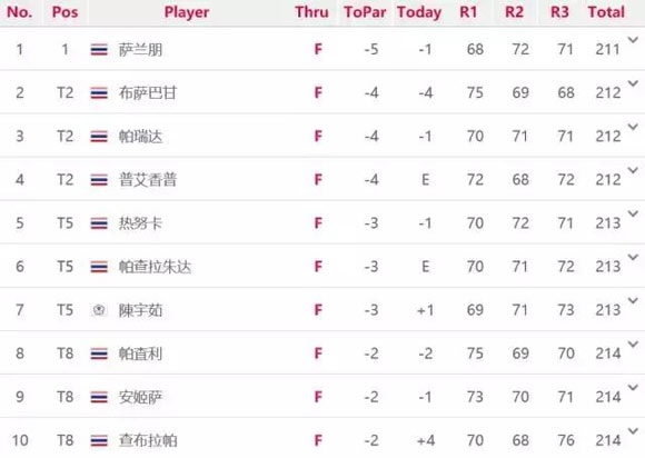 在上周刚刚结束的PTT泰国大师赛中,泰国球员发挥神勇,前十名中有9名为泰国球员,前二十名中泰国球员占14位。其中冠军萨兰朋夺取了个人第3座女子中巡奖杯,同时也是这位17岁姑娘在2017赛季的第6个冠军。