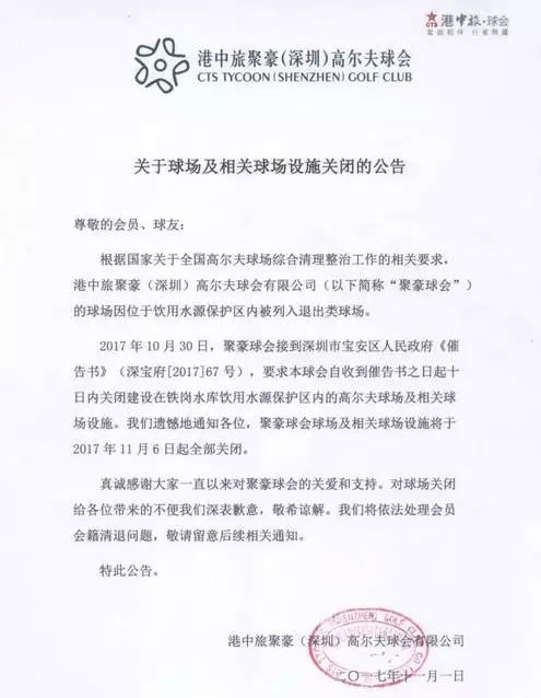 球会于10月30日接到深圳市宝安区人民政府《催告书》(深宝府[2017]67号),要求球会在限定日期内关闭建设在铁岗水库饮用水源保护区内的高尔夫球场及相关球场设施。球会决定在11月6日关闭全部球场及相关球场设施。