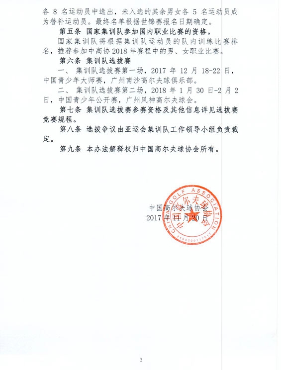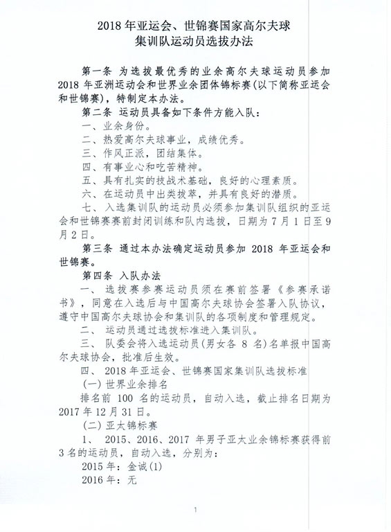 2018年亚运会、世锦赛国家高尔夫球集训队运动员选拔办法(详见下方通知原件)