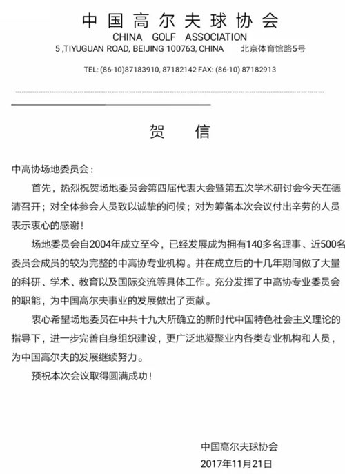 上午9点,“中国高尔夫球协会场地委员会第四届代表大会暨第五次学术研讨会”正式开幕。中国高尔夫球协会场地委员会办公室主任段小春先生宣读中国高尔夫球协会致本次大会的贺信。中国高尔夫球协会热烈祝贺场地委员会第四届全国代表大会暨第五次学术研讨会的召开,并对全体参会人员致以诚挚的问候,对为筹备本次会议付出辛劳的人员表示衷心的感谢。