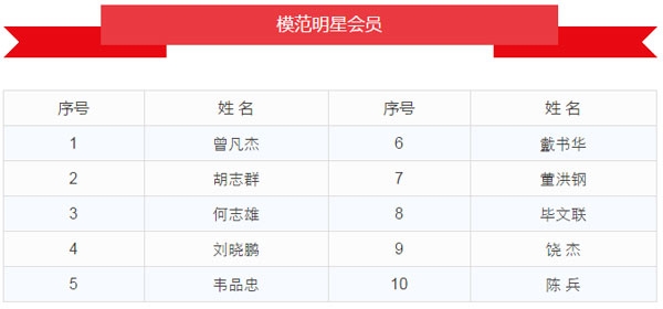 为展示九龙湖会员独特的风彩,增进会员与员工之间的友好和谐,创造更优质的九龙湖文化内涵,从2017年5月起,球会开展了每月“模范明星会员”评选活动,由全体球童投票评选出了前十名会员,名单如下表(排名不分先分后)。