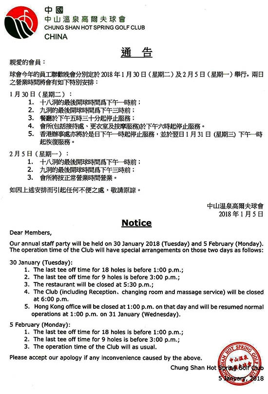 广东中山温泉高尔夫球会2018年员工联欢晚会公告