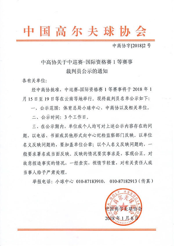 中国高尔夫球协会1月8日发布“中高协关于中巡赛-国际资格赛1等赛事裁判员公示的通知”,对年初即将举办的一些赛事裁判员名单进行公示,通知如下: