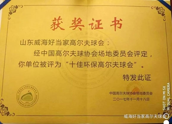 2017年11月21日,中国高尔夫球协会场地委员会第四届全国代表大会暨第五次学术研讨会在浙江德清正式开幕!威海好当家高尔夫球会获得由中国高尔夫球协会场地委员会颁发的荣誉称号——“十佳环保高尔夫球会”。