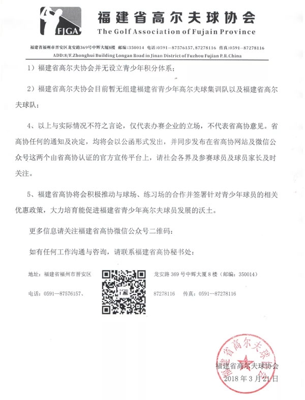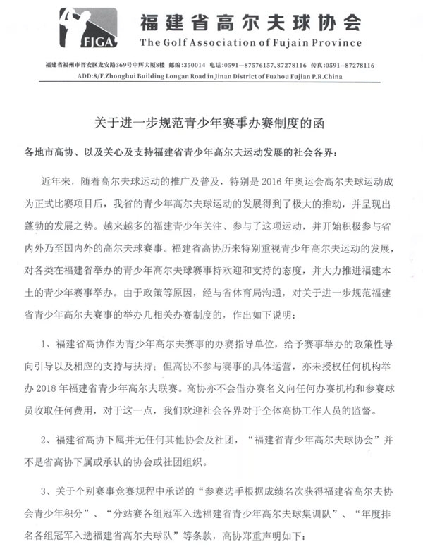3、关于个别赛事竞赛规程中承诺的“参赛选手根据成绩名次获得福建省高尔夫协会青少年积分”、“分站赛各组冠军入选福建省青少年高尔夫球集训队”、“年度排名各组冠军入选福建省高尔夫球队”等条款,高协郑重声明如下: