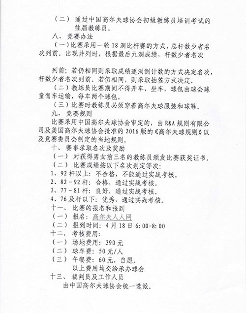 近日中高高尔夫球协会下发通知,将举办2018年第三期初级教练员培训。本次培训的最大亮点是,计划在培训期间开展实战考核试点工作。考核将采取男、女18洞比杆赛形式,92杆以上者不合格,不能通过实战考核。