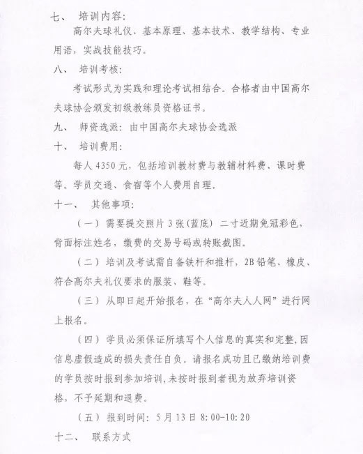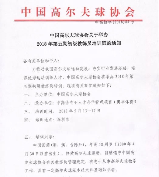 各有关单位和个人:为推动我国高尔夫球运动发展,夯实行业发展基础,培养优秀运动训练人才,中国高尔夫球协会将在深圳举办2018年第五期初级教练员培训。