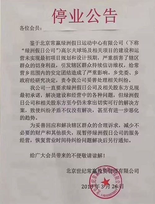3月28日,常营农工商再此在球场内张贴出一份“关于限期解决北京常赢绿洲假日运动中心项目建设和经营中存在问题的函件”称:绿洲公司存在“私自建设球场对外出售球卡,没有向常营农工商公开项目收入,没有按照约定雇佣村民”等违法违规行为,要求7天之内拿出确实可行的解决方案,否则将收回土地。
