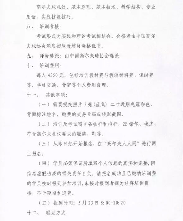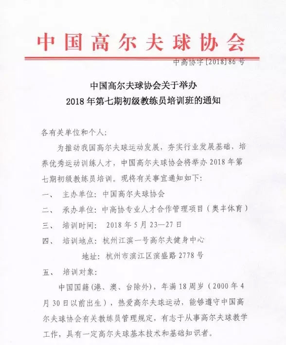 为推动我国高尔夫球运动发展,夯实行业发展基础,培养优秀运动训练人才,中国高尔夫球协会将举办2018年第七期初级教练员培训。现将有关事宜通知如下:
