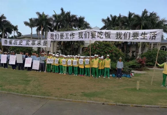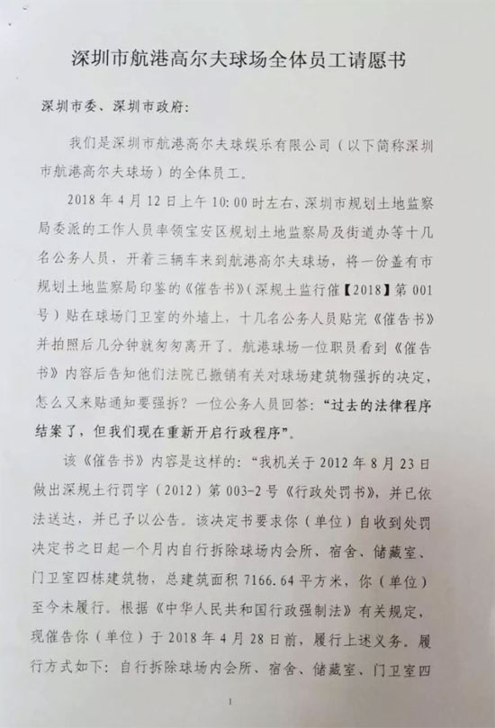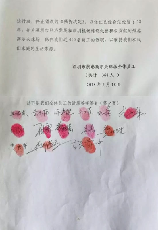 据了解,深圳航港高尔夫球场将近400名员工在球场拉起横幅,并附上员工签名,向深圳市市委,市政府请愿,希望能够停止强拆,保住员工饭碗。