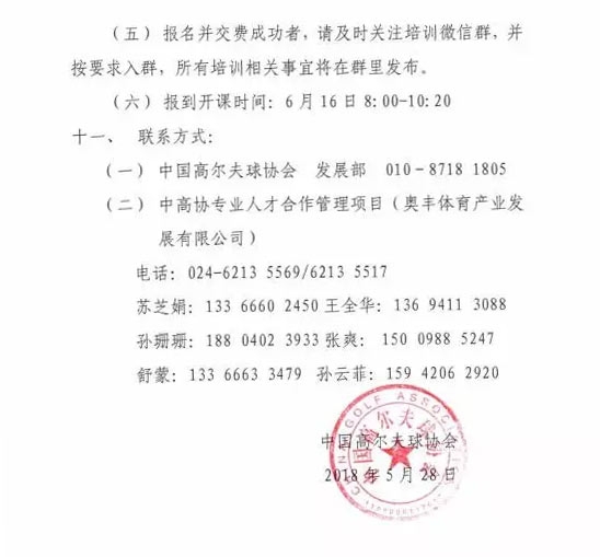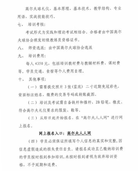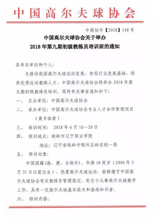 为推动我国高尔夫球运动发展,夯实行业发展基础,培养优秀运动教练人才,中国高尔夫球协会将举办2018年第九期初级教练员培训。现将有关事宜通知如下: