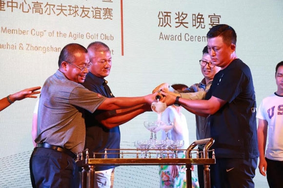 众多的奖项,让晚宴欢乐无限!颁奖晚宴高潮环节,傅勇捷与获奖嘉宾、颁奖嘉宾一起开香槟庆祝赛事的圆满成功!期待下一届会员杯,我们再聚!