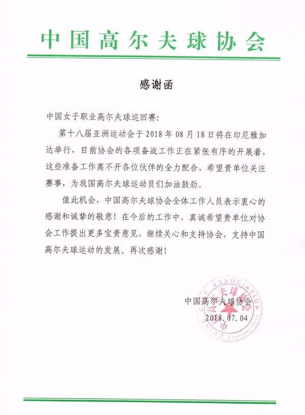北京时间7月5日消息,昨日中国高尔夫协会向中国女子职业高尔夫球巡回赛(简称女子中巡)颁发感谢函,感谢女子中巡为亚运会的准备工作所做的配合。感谢函原文如下: