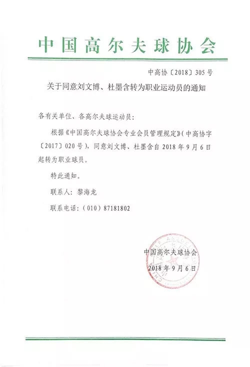 北京时间9月7日,昨日中国高尔夫球协会发布了《关于同意刘文博、杜墨含转为职业运动员的通知》,同意刘文博、杜墨含自2018年9月6日起转为职业球员。