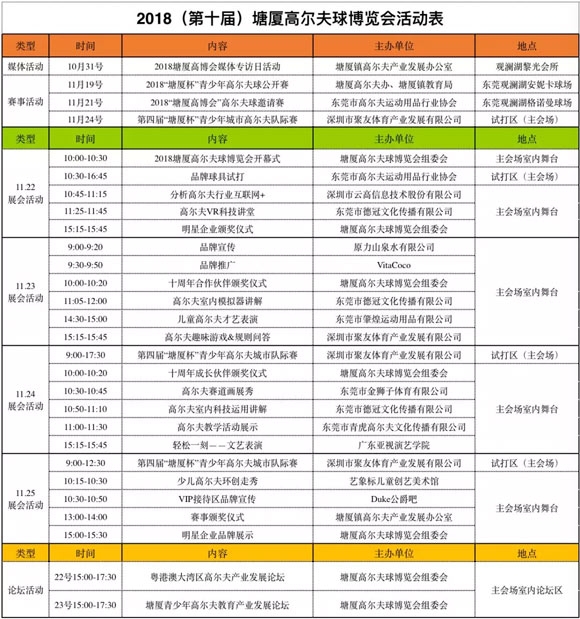展会期间,组委会还将举办2018“塘厦杯”青少年高尔夫球公开赛、2018“塘厦高博会”高尔夫球邀请赛、第四届“塘厦杯”青少年城市高尔夫队际赛等赛事,以及举办塘厦青少年高尔夫教育产业发展论坛、粤港澳大湾区高尔夫产业发展论坛等活动,以展会+赛事+论坛形式,开启10年新征程。目前组委会已发出上万份专业采购商邀请函,本届展会参观参展人数预计超过8万人次。