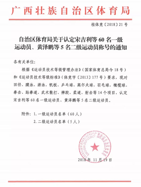 11月19日,自治区体育局发布文件(桂体竞【2018】21号):根据《运动员技术等级管理办法》(国家体育总局令18号)和《运动员技术等级标准》(体竞字【2013】177号)要求,对田径、蹼泳、游泳、帆板、乒乓球、高尔夫球、羽毛球、橄榄球、拳击、跆拳道、武术散打、摔跤、柔道、射击等14个项目的60名一级运动员、5名二级运动员进行认定,其中:陆又玮、刘泳恒获得高尔夫球一级运动员称号,王柏程获得高尔夫球二级运动员称号。