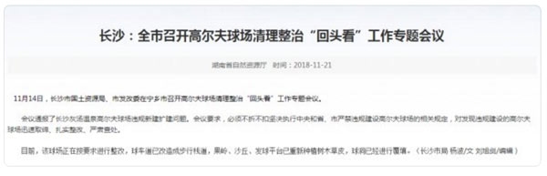 日前从长沙市国土资源局获悉,11 月 14 日,长沙市国土资源局、市发改委在宁乡市召开高尔夫球场清理整治 " 回头看 " 工作专题会议。
