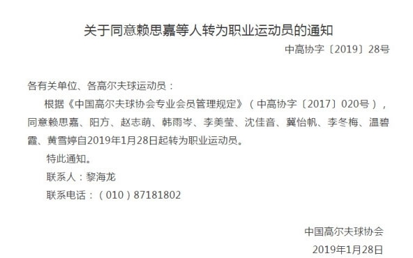北京时间2019年1月28日,中国高尔夫球协会竞赛部发布了关于同意赖思嘉、阳方、赵志萌、韩雨岑、李美莹、沈佳音、冀怡帆、李冬梅、温碧霞、黄雪婷自2019年1月28日起转为职业运动员的通知。