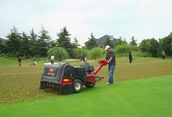 与果岭一样,长时间的人员踩踏和球车碾压,使得球道土壤也十分紧实,空心孔作业会缓解草坪表面紧实或芜枝层过厚所导致土壤的渗透能力,促进打出土卷后洞内根的生长,增加了草坪土壤与空气、水分的接触面积,提高了土壤的吸水透水性和土壤的通气性,提高了土壤的释放氧分能力,并且加快了地面芜枝层和其他有机残渣的分解速度。