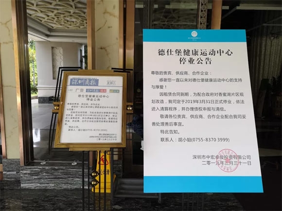 据报道,香蜜湖的德仕堡于2019年3月31日正式发布停业公告,宣布停业:“因租赁合同到期,为配合政府对香蜜湖片区规划改造,我司定于2019年3月31日正式停业,依法进入清算程序,并办理债权申报与清偿。”