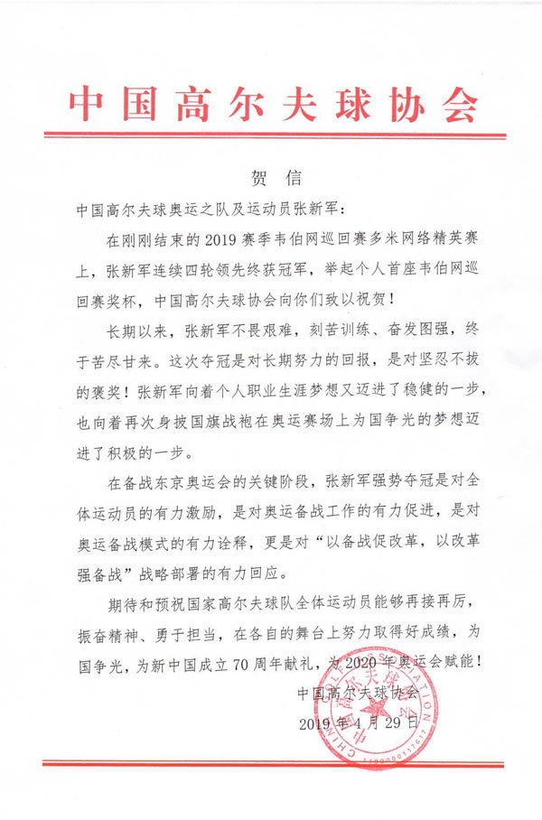 期待和预祝国家高尔夫球队全体运动员能够再接再厉,振奋精神、勇于担当,在各自的舞台上努力取得好成绩,为国争光,为新中国成立70周年献礼,为2020年奥运会赋能!