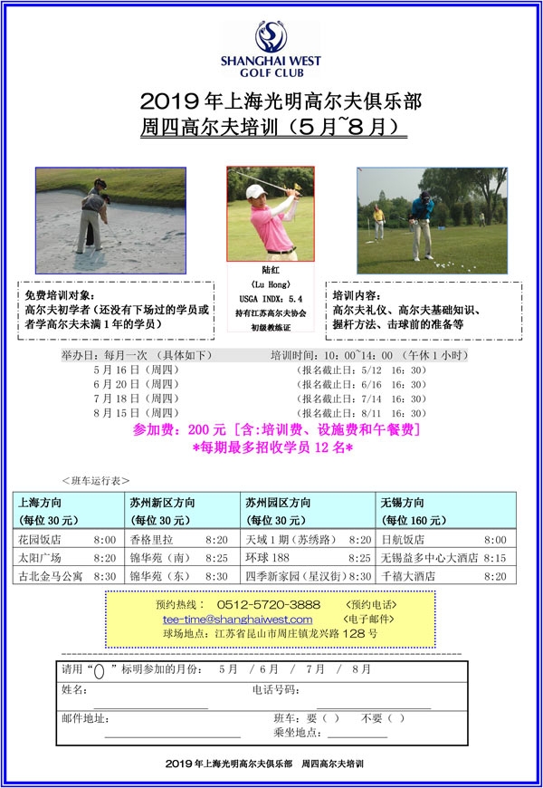 上海光明高尔夫俱乐部周四教程安排(5月-8月)