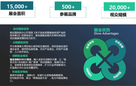 深圳国际高尔夫运动博览会将携手众多行业协会机构及媒体, 响应国家关于加快发展健身休闲产业的指导意见政策,在新市场环境与需求下,打造兼具娱乐性与专业性的高尔夫运动展示空间,通过产品展示、时尚发布,互动交流等系列活动,带来中国市场首个真正意义上的体验式高尔夫嘉年华,以新的商业视角,扩大高尔夫参与群众基础、培育青少年高球新生代、发展女性高尔夫,为参展商带来更多商机及流量。