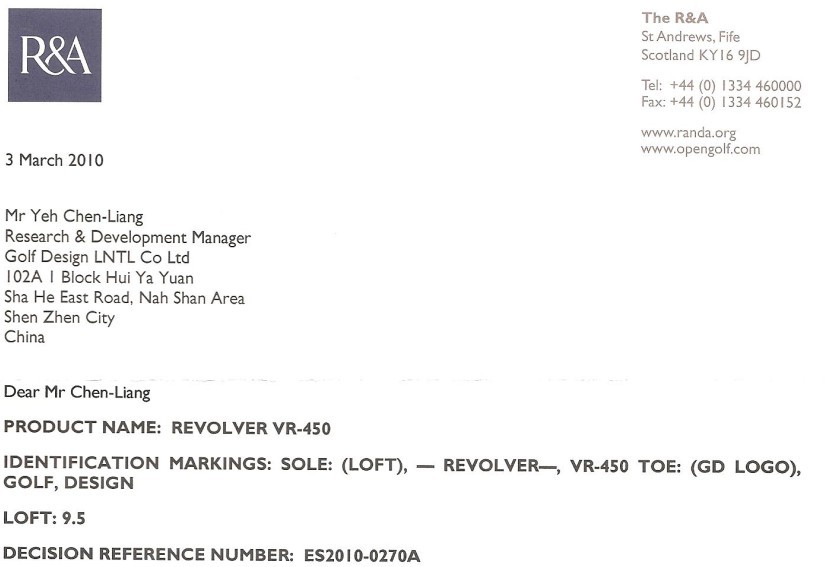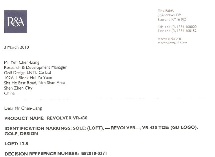 研宝高尔夫GD品牌球杆于2010年正式通过R&A规则的检测,符合R&A规则对球杆的限制,可以在R&A规则下的所有正式比赛时使用。此次通过检测的有GD一号木杆、GD I-09系列铁杆组、GD挖起杆58度、52度。
