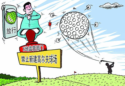 在山东省文登市,一个名为“揽月湖旅游度假村”的建设项目正在紧锣密鼓地施工。这个占地1300亩的项目名为度假村,实质是高尔夫球场。尽管国家早就明确规定停建新的高尔夫球场项目,但由于当地监管部门对此项目“一路绿灯”,致使这个违规项目得以顶风推进。(2月17日《经济参考报》)