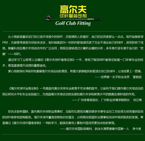 《高尔夫球杆量身定制》一书,是国内高尔夫专业教育不可多得的专业教材,它有利于我们提升高尔夫球运动理论研究的认识水平和专业能力,为我国高尔夫球运动的发展和高尔夫学院教育水平的提高发挥积极的作用。