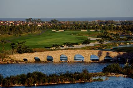 这里是中国很靠东的地方,当然也是太阳最早升起的地方之一。头顶的云在海风的推动下匆匆移动,四处遮挡阳光,把影子撒落在球道上,让绿色的草坪忽明忽暗。走在球道上,面对远处的浩瀚海面,一切是那么宁静,似乎能听见一百多年前甲午海战的隆隆炮声。