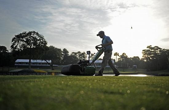 5月9日,在美国高尔夫职业巡回赛,球手锦标赛前,赛事承办球场-锯齿球场的工作人员,在做赛前准备工作。