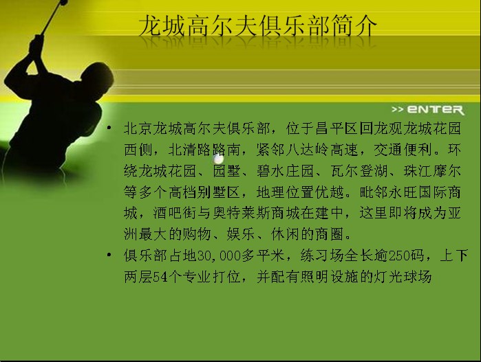 地址:北京市昌平区回龙观龙城花园西龙城高尔夫俱乐部 联系电话:18801306522 联系人:赵女士