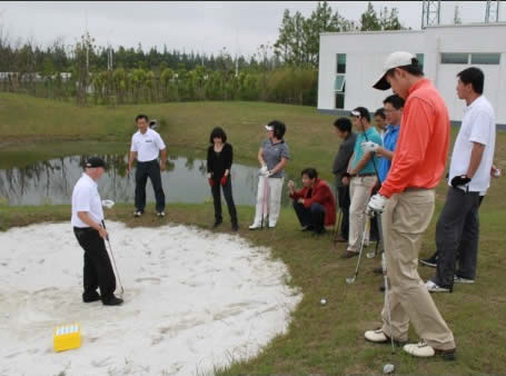 为全面提升上海高校高尔夫教师的教学水平并与国际高尔夫专业培训接轨,上海大学生体育协会高尔夫分会特别邀请欧洲高尔夫教练联盟E.G.T.F为上海高校教师进行培训。第二期培训学员新增了上海机电大学等学校在职高尔夫老师。培训地点选在距离市区较近的长兴岛桔园高尔夫练习场进行。设施良好的训练场地,加上一个真草小三杆洞,铁杆,沙坑,劈起,短打都在真草中实地培训,让平时难于下场的老师们大呼过瘾,也取得非常好的教学效果。