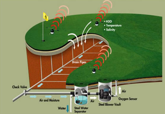 首先透过埋在草皮土壤裡深4英吋至8英吋的感测器元件,监测土壤环境中的湿度、温度与盐份的数据,其次透过埋在接近草皮的无线网路传输节点设备「尘埃(mote)」进行资料的无线传输,当资料传送至基地台并存入资料库后,管理者可透过个人电脑或智慧型手机进入管理系统平台进行监控并决定后续草皮养护动作。