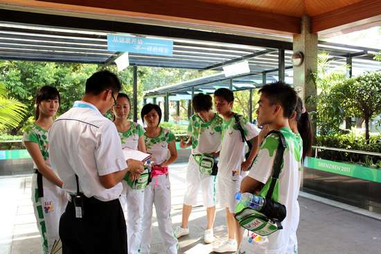 上午的培训结束后,志愿者们集中用餐。经过短暂的休息后又投入到全市的联调联试工作中。志愿者们分业务口对服务工作进行了再次培训,应对往日培训中发现的问题进行了调整,对工作安排进一步细化,对在岗人员进行优化调整,以便大运期间各岗位工作能高效进行。