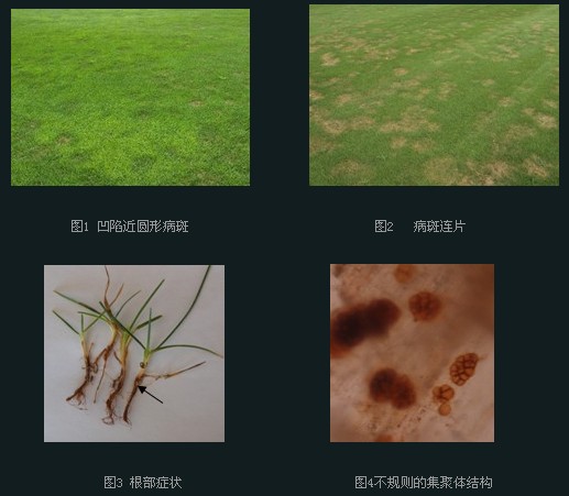 夏季斑枯病是夏季高温高湿时,发生在冷季型草坪草上的一种具有毁灭性的病害,尤其在草地早熟禾草坪上。夏初开始表现症状,发病草坪最初出现圆形或马蹄状、凹陷的小病斑(直径3-8cm,大多不超过40cm),病斑内草株不长,叶片呈灰绿色并逐渐枯黄死亡(图1),在持续高温天气下,病情迅速发展,草坪多处呈现不规则形斑块,且多个病斑愈合形成大面积的不规则形枯草区。在高尔夫球场上,枯斑直径达30cm(图2)。典型病株根部、根冠部和根状茎呈黑褐色,后期维管束也变成褐色,外皮层腐烂,整株死亡(图3)。仔细检查这些病组织,可以发现典型的网状稀疏的深褐色至黑色的外生菌丝。将病草的根部冲洗干净,直接在显微镜下检查,也可见到平行于根部生长的暗褐色匍匐状外生菌丝,有时还可见到黑褐色不规则聚集体结构(图4)。