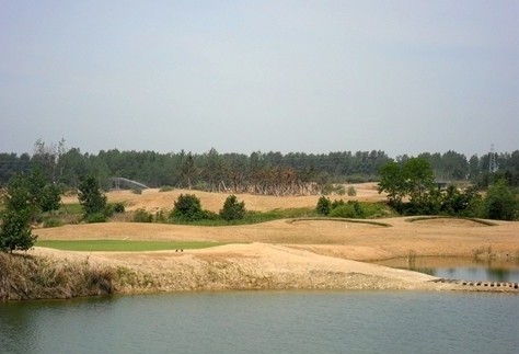 而近距离接触可以见到,在清澈见底的湖水四周,延绵起伏着由丘陵改造的“果岭”,地势平坦的地块被修葺成 “球道”,人工打造的障碍沙坑错落有致,除了场地草坪待整理外,一座高尔夫球场雏形已具。