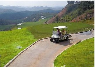 闯关后,摩托车终于驶进了高尔夫球场,顺着蜿蜒几公里长的球道由上而下,又由下而上,弯弯曲曲的山道旁十几座山头,看上去都已披绿,山道间还分别辟有18个高尔夫球洞的标志和方向指引,山头的高处有一批人正在观察着我们的动向。